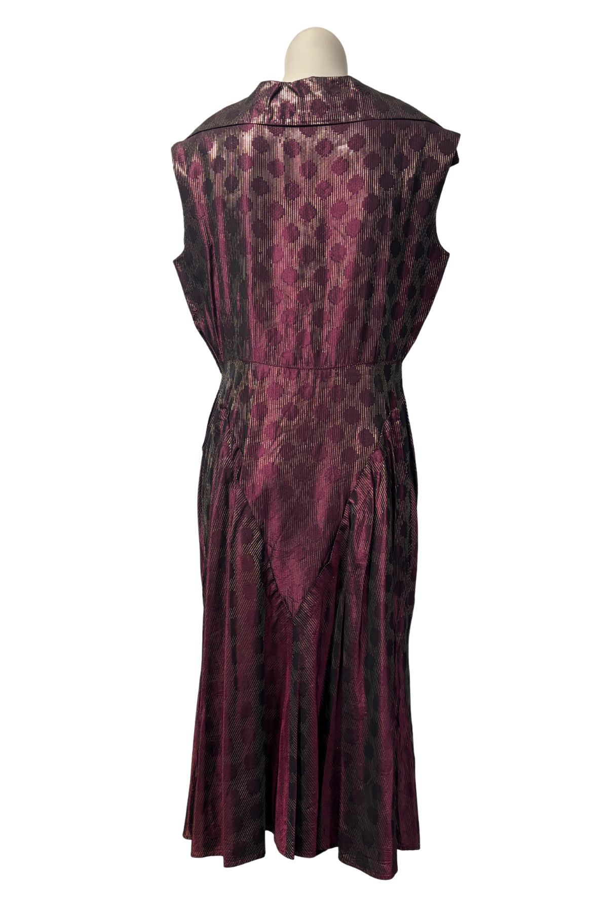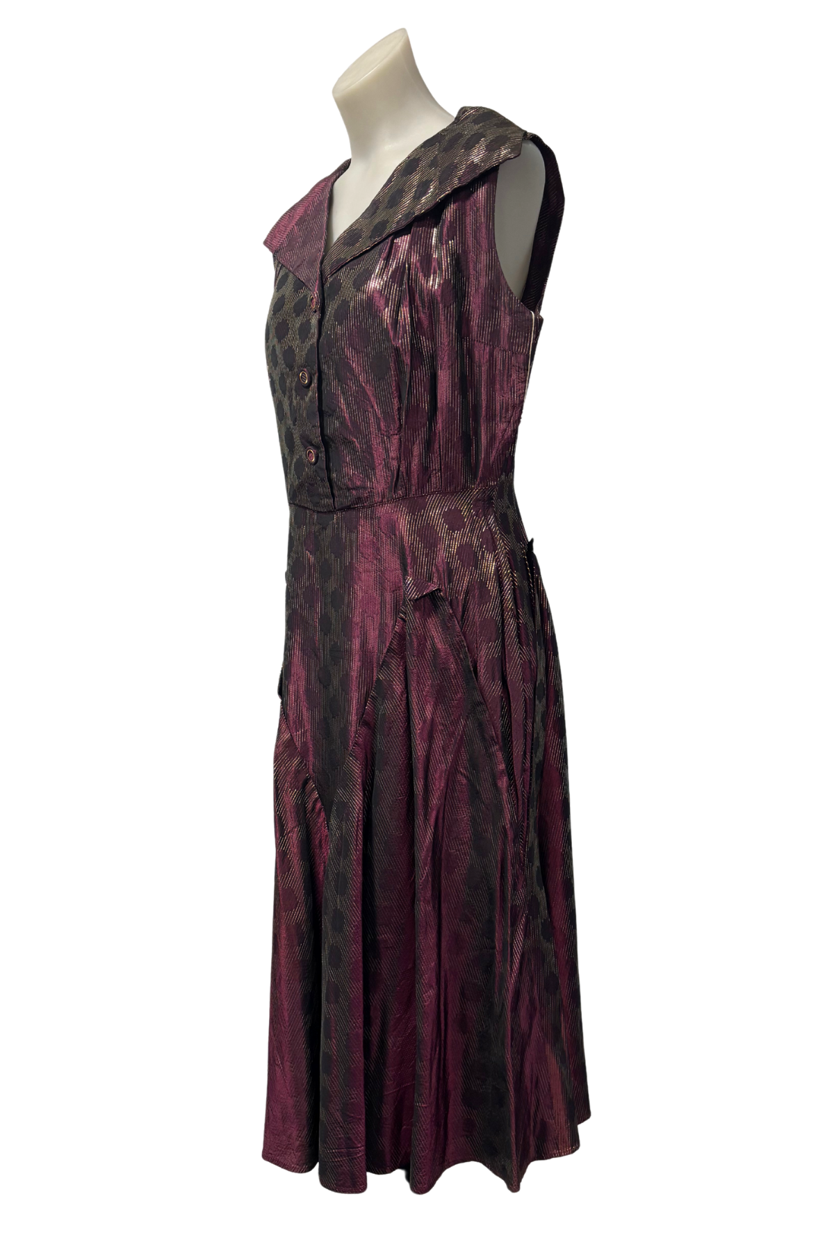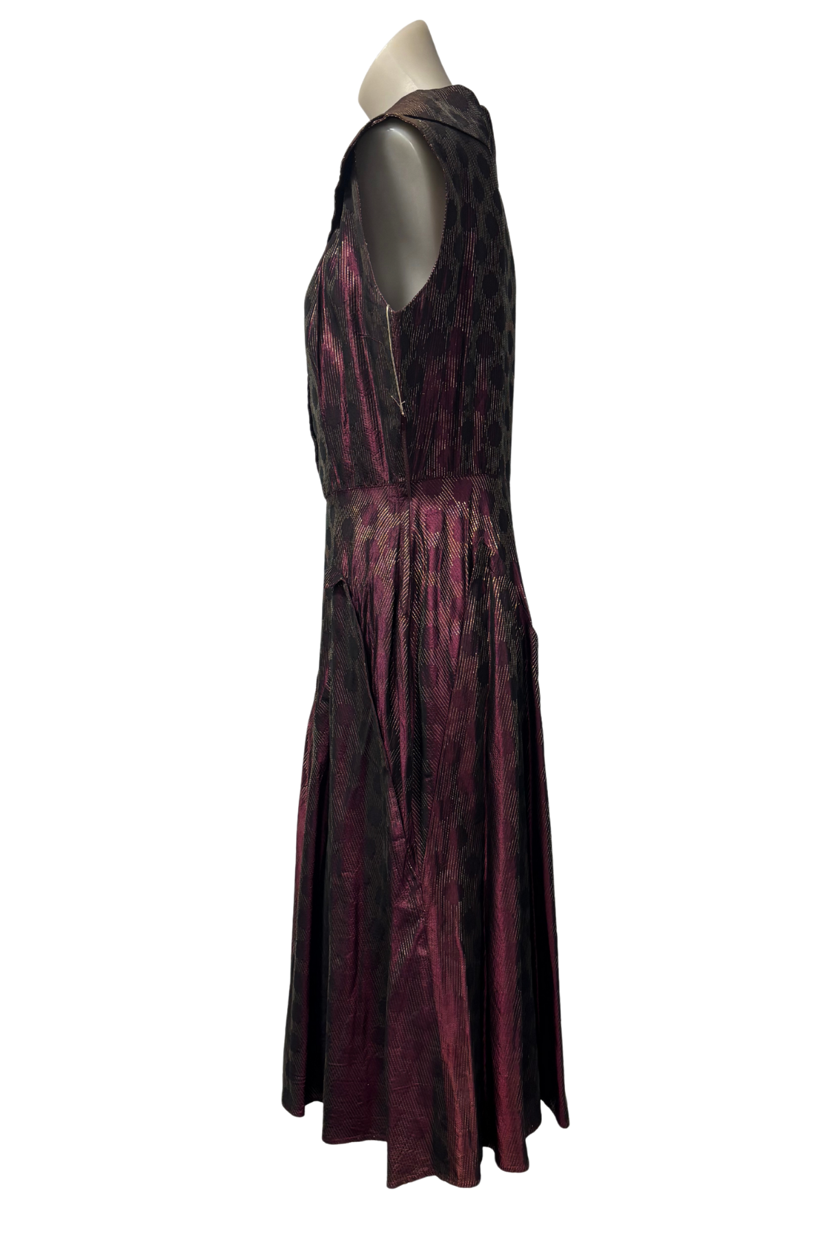 A striking 1950s maxi dress in a flashy gold and burgundy fabric. Designed with an elegant wide collar that extends over the shoulders, this button-down dress features a dramatic drop-waist silhouette and gorgeous detailing throughout. A bold yet sophisticated vintage statement piece.