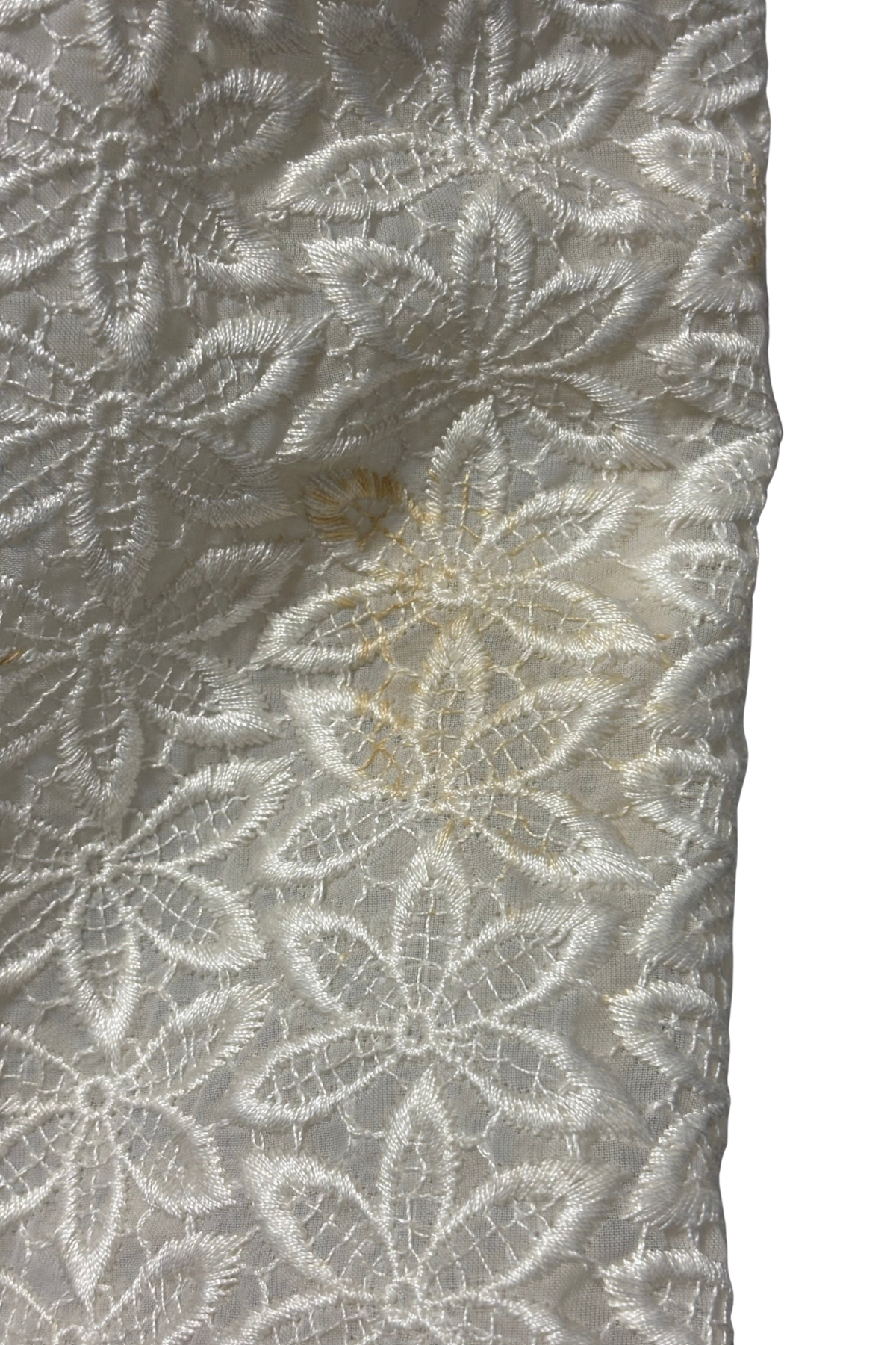 A beautifully simple vintage wedding dress from the 1960s/70s. This elegant A-line gown is crafted in white polyester and features embroidered mesh flowers throughout, each with a small faux pearl bead at the centre. The dress has charming pointed sleeves finished with faux pearl buttons and a nylon side zip. A timeless, romantic piece.