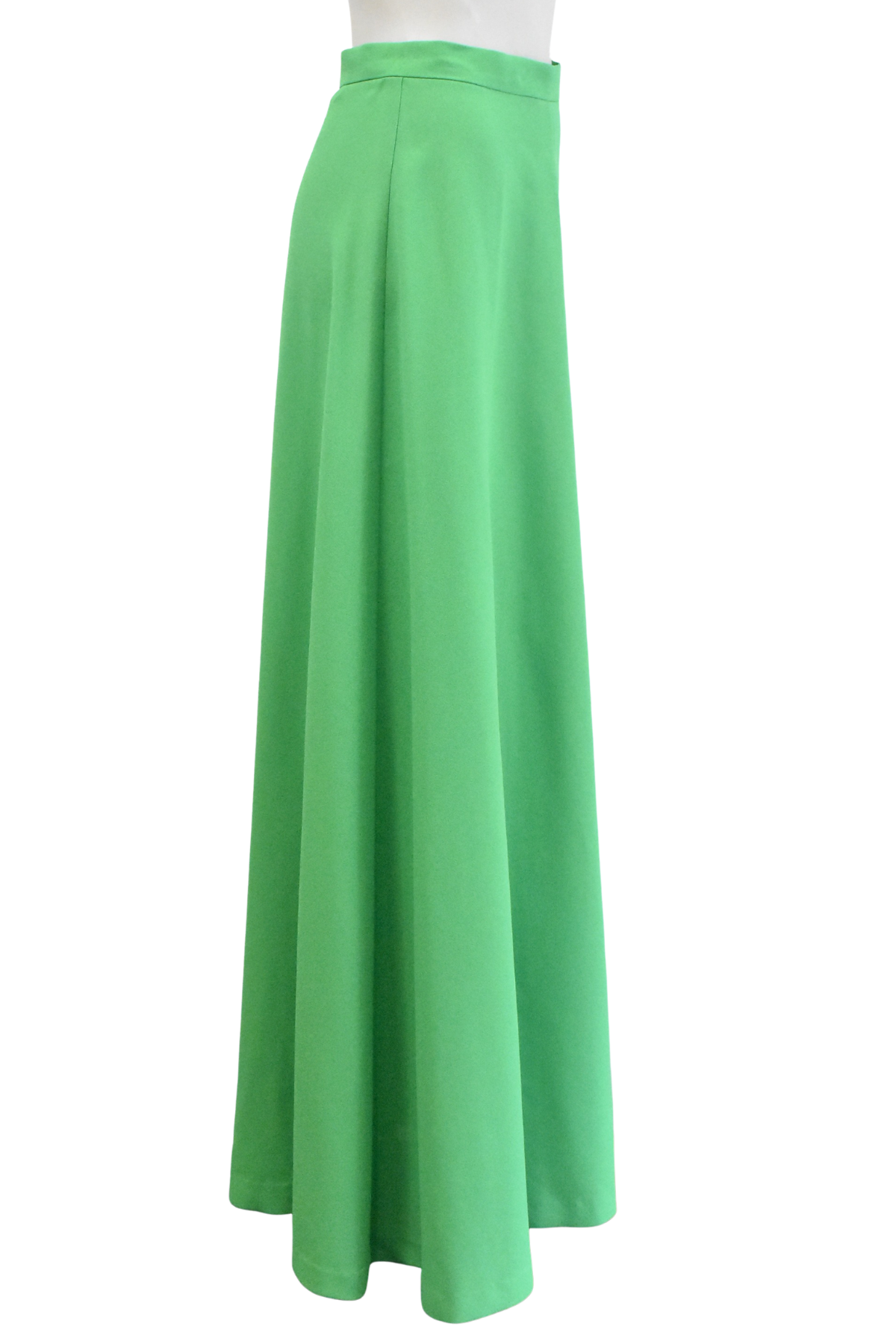 A striking retro suit set from this classic New Zealand fashion house, featuring an apple green blazer with sharp collar, elasticated lace-trimmed cuffs, and lace-lined lapels. The long A-line skirt comes with a matching fabric belt for a perfectly coordinated look. A vibrant gem from another era, perfect for vintage lovers seeking a statement ensemble.