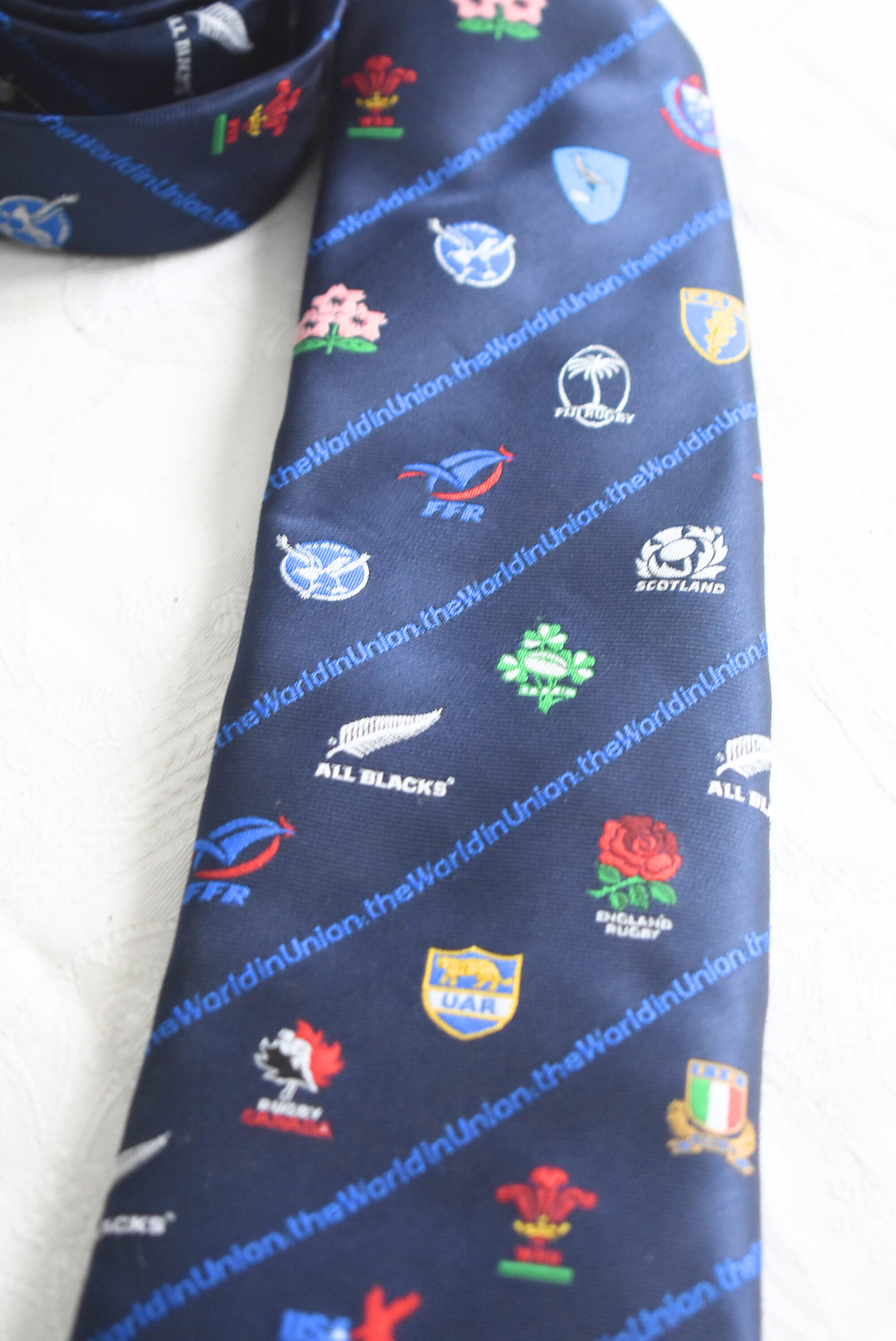 Description: A Rugby World Cup 2003 tie made from 100% polyester. This collectible piece is perfect for rugby enthusiasts, offering a stylish and meaningful addition to formal attire. A great conversation starter or gift for a sports fan.