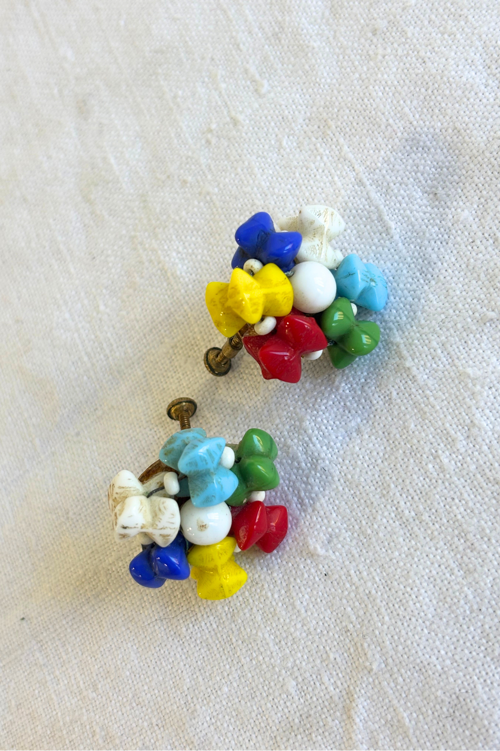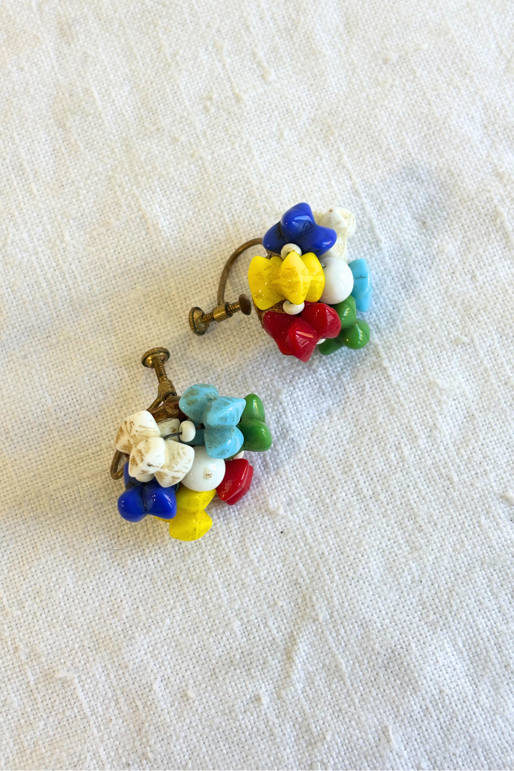 - Description: These earrings feature multi-colored glass that adds a touch of nostalgia to any look. Easy to wear screw-on design makes these earrings a stylish and comfortable choice for any occasion.