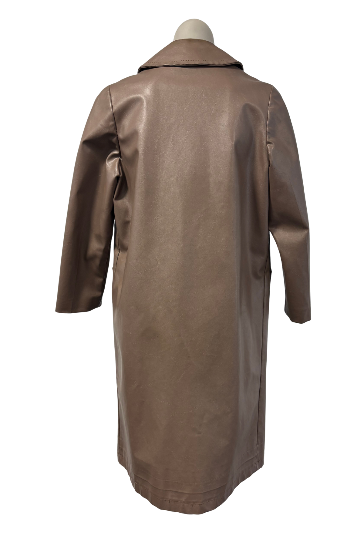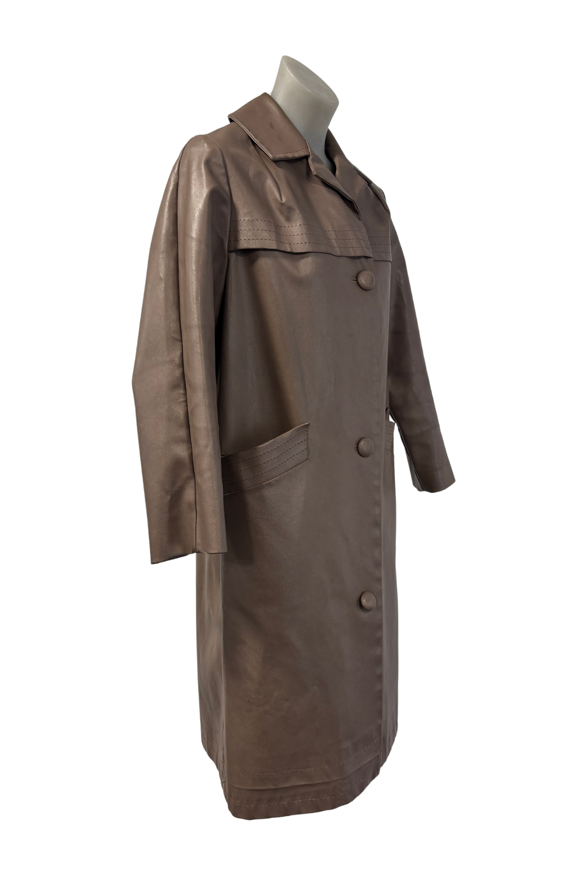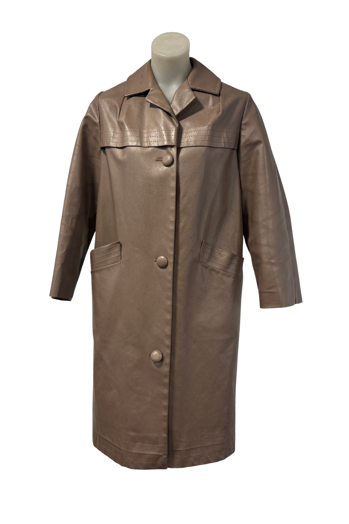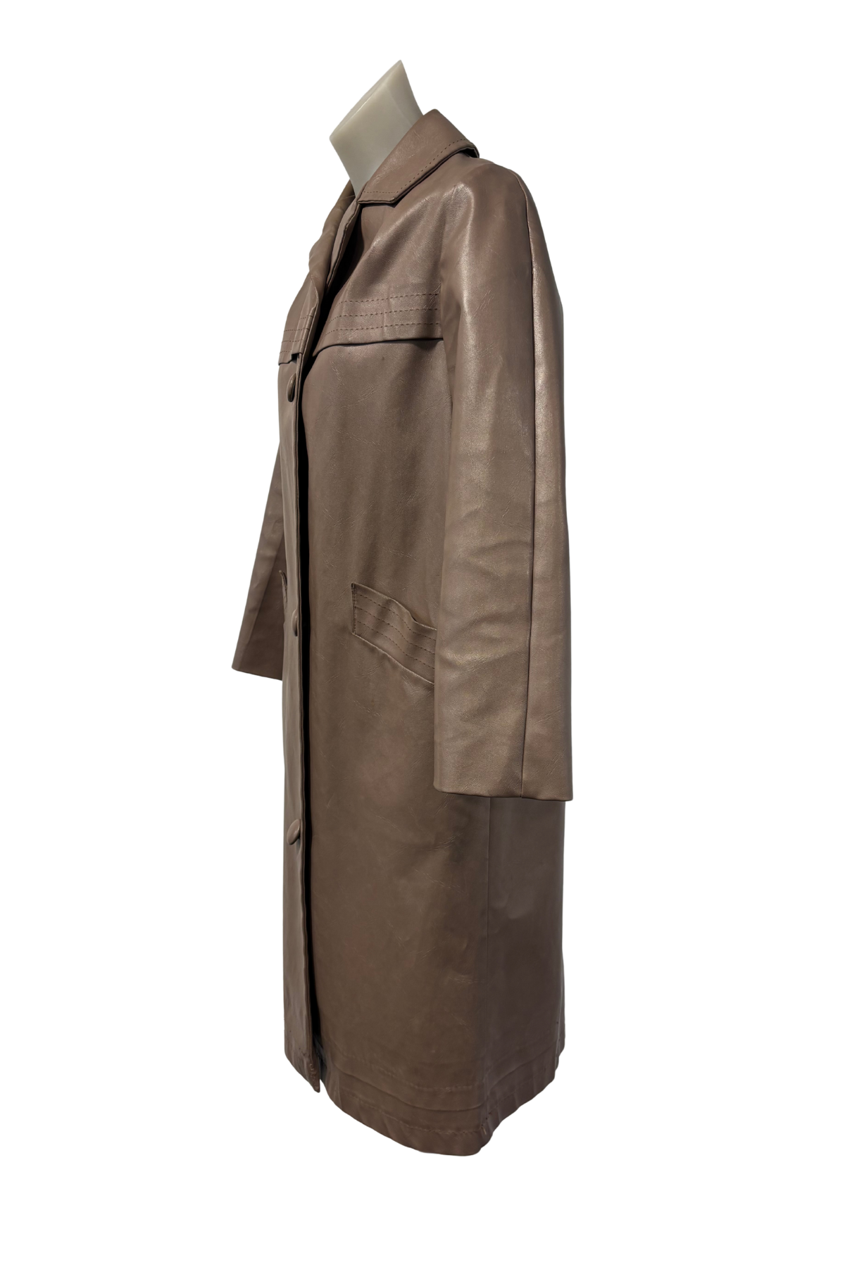 A rare New Zealand made piece from the 1990s, this vintage Skellerup long-line jacket is crafted in light brown faux leather. With its slim fit and button-up design, it has a sleek, structured silhouette that makes it perfect for layering over both casual and dressy looks. A unique find from an iconic Kiwi brand.