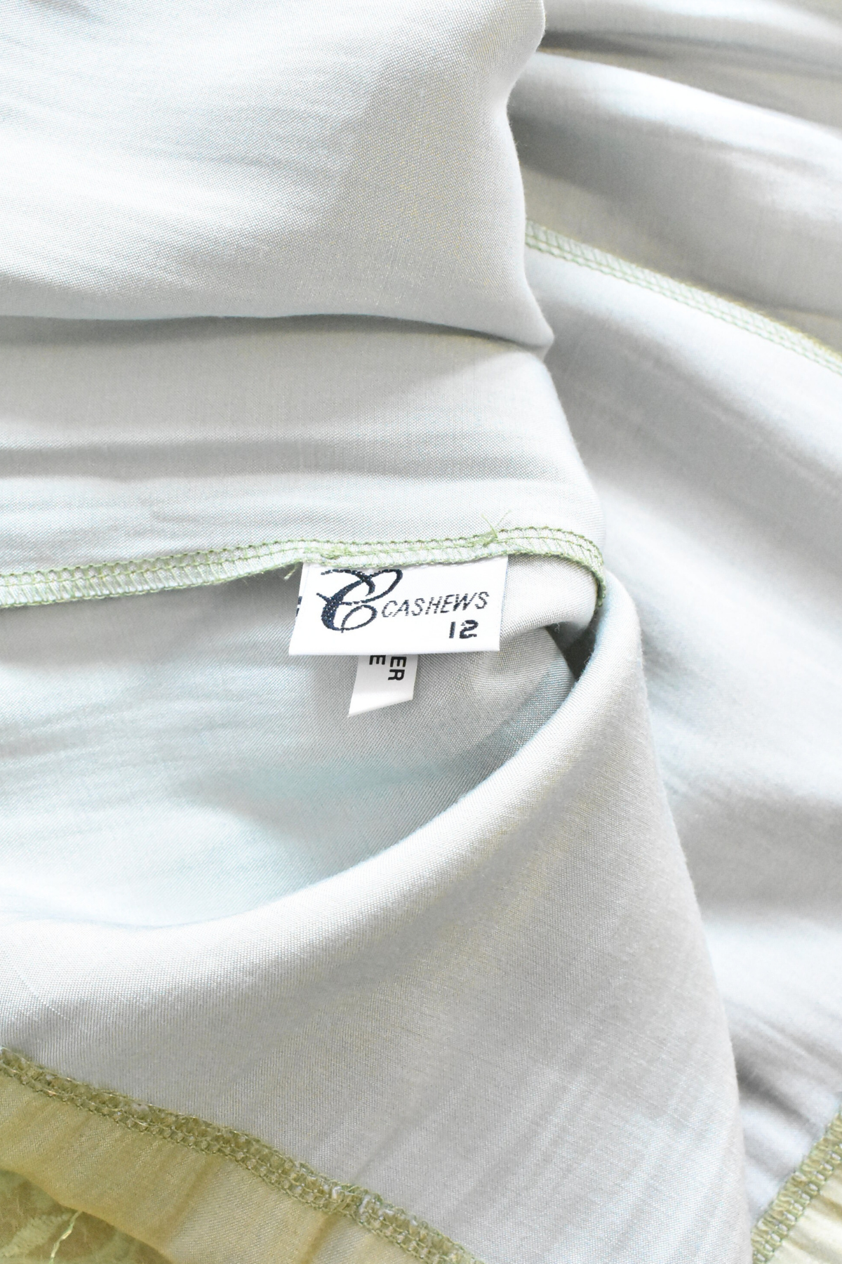 This vintage Cashews top is a beautiful example of the brand’s attention to detail and timeless style. Made in New Zealand, it features a sage green mesh base overlaid with delicate floral lace, creating a light, airy feel that is both feminine and versatile. The semi-sheer design makes it perfect for layering — wear it casually over a simple cami with jeans, or dress it up with a skirt or tailored pants for an elegant evening look.