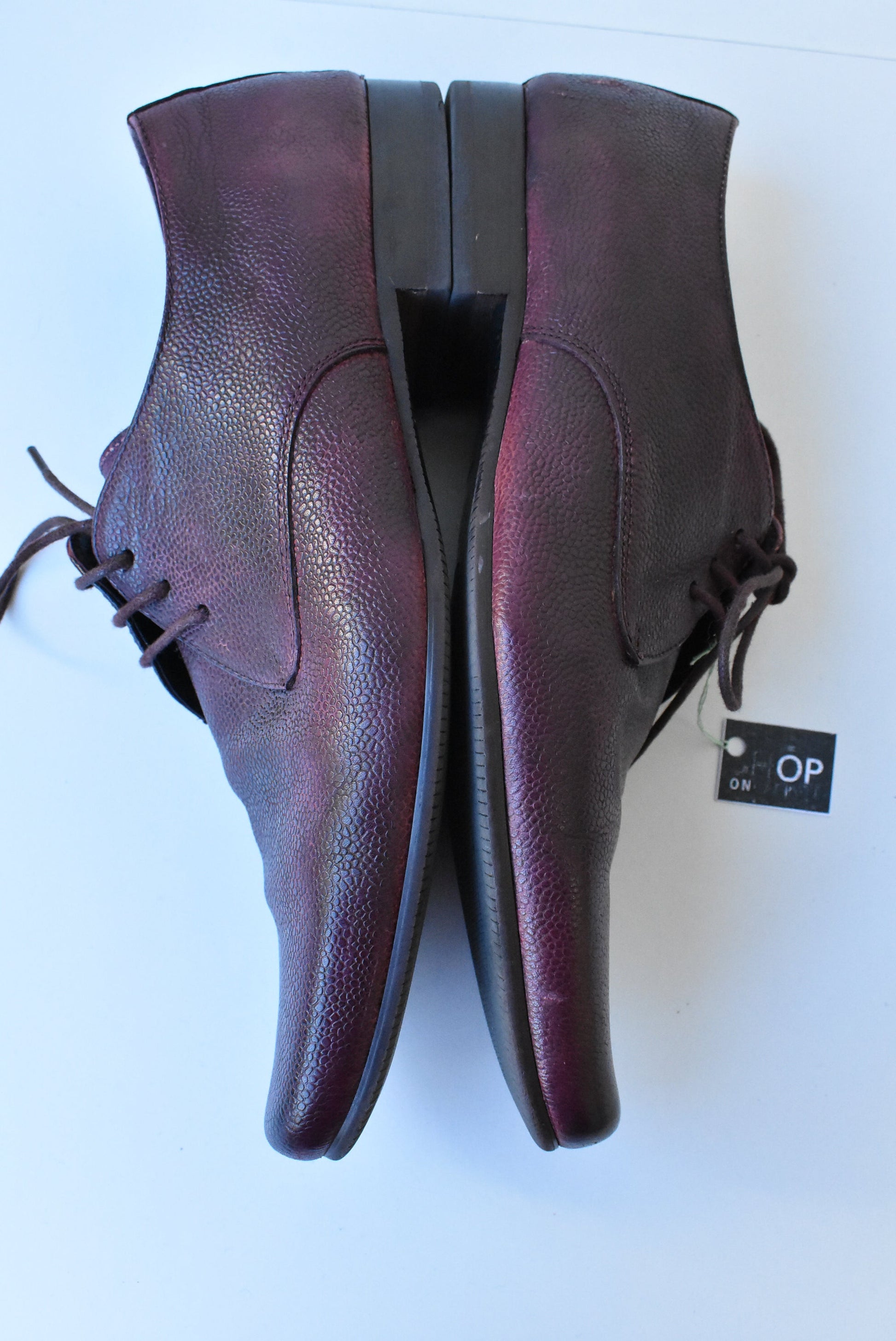- Description: dark red-purple 'scaly' leather oxfords. Neat and not too sober.