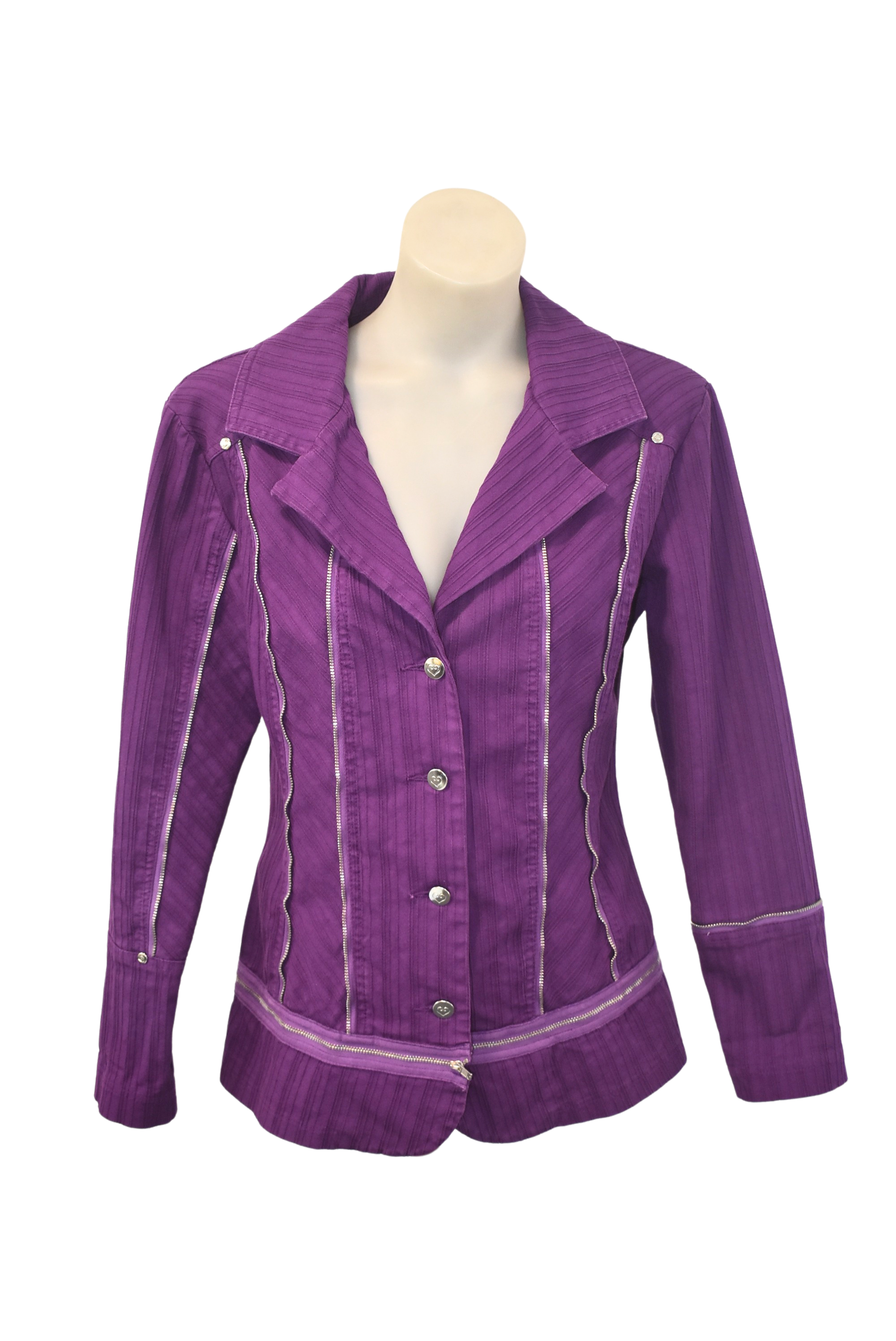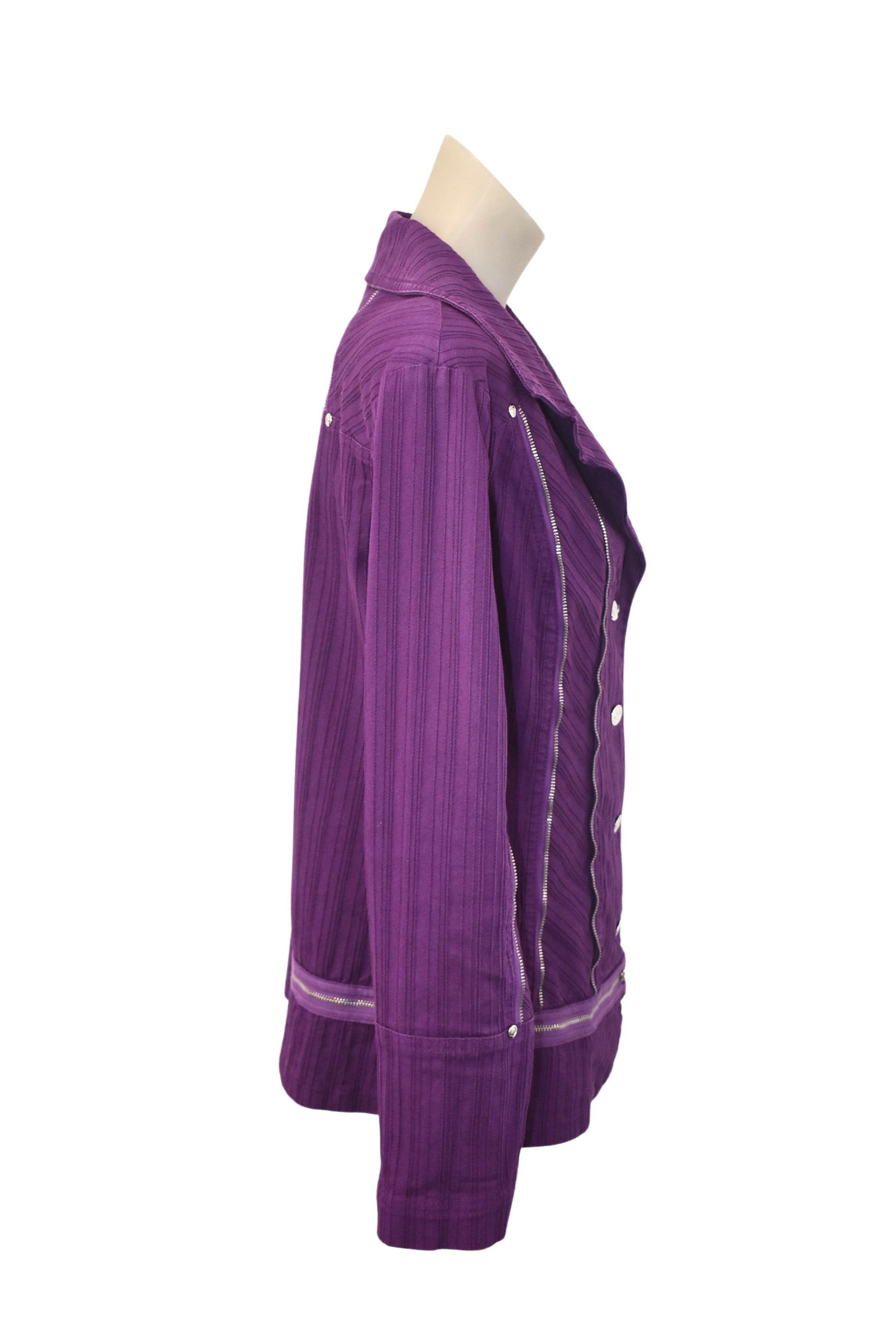 Description: A funky, eye-catching purple jacket from Kooky, featuring silver hardware and decorative zips. Made from cotton and spandex, it offers both comfort and stretch for a flattering fit. This jacket is in great condition, barely worn, and perfect for adding a bold statement to any outfit.