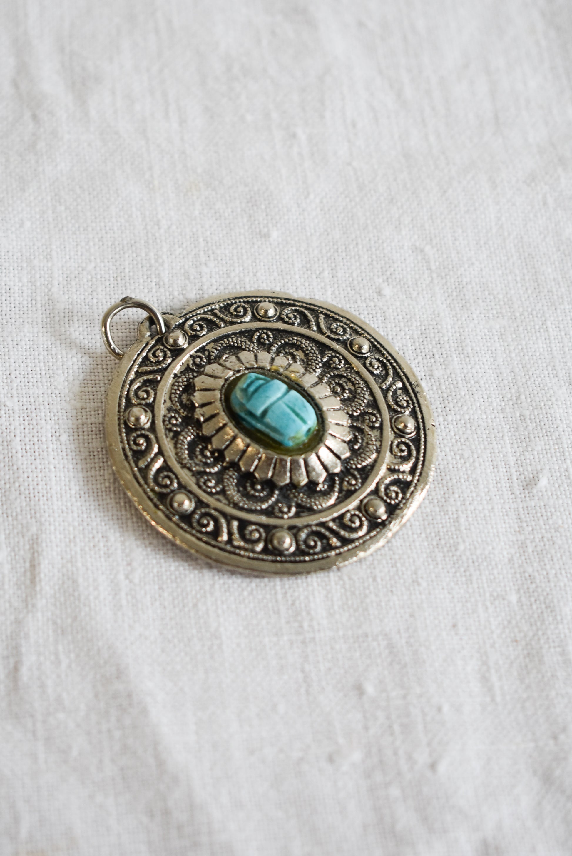 - Description:Command attention with our Large Metal Regal Pendant. Featuring an intricate design with a striking blue stone bead set in clear resin, this bold piece radiates sophistication and timeless elegance. A perfect centerpiece for any outfit.